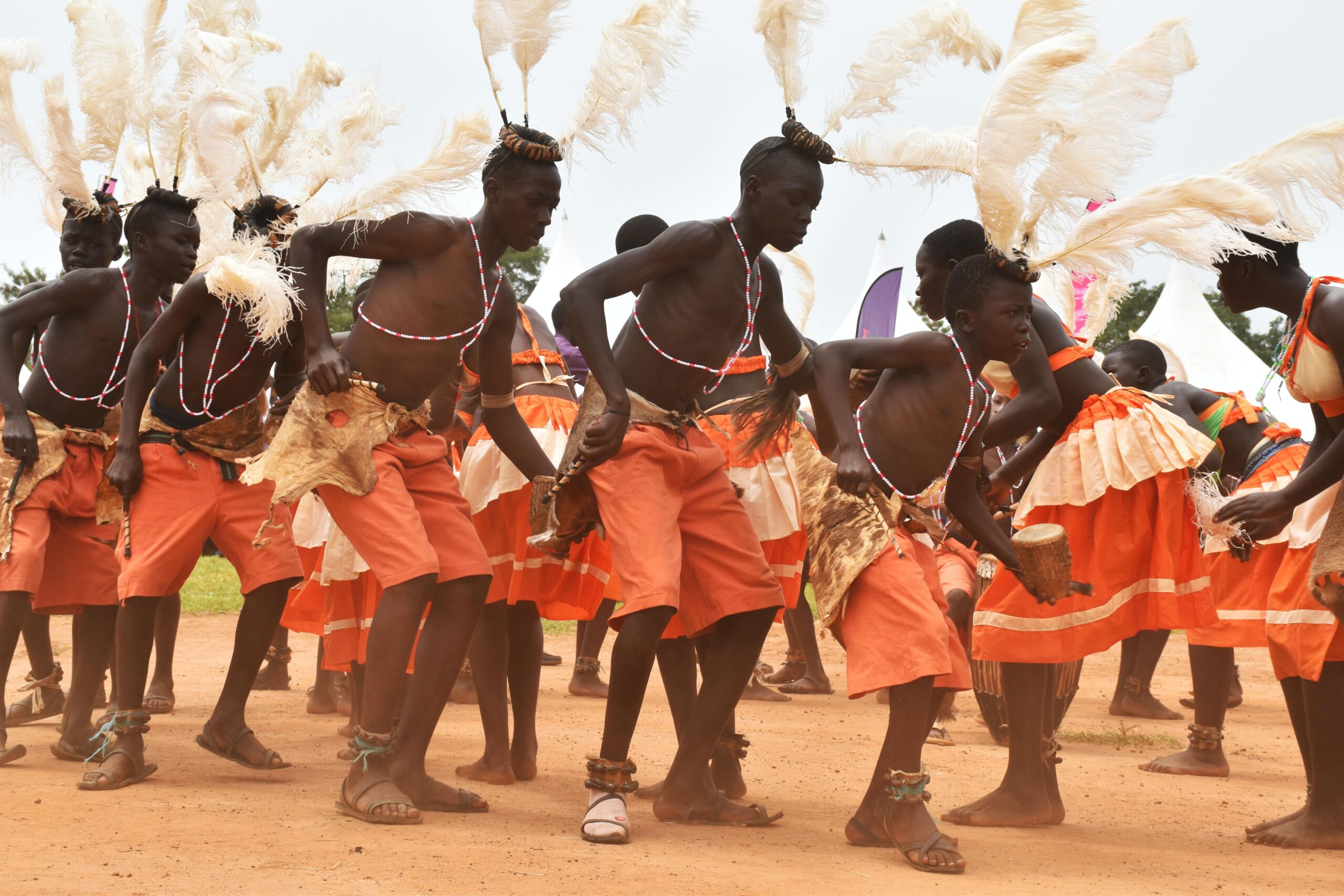 تعد الموسيقى والرقص جزءًا مهمًا من التراث الثقافي لأوغندا، وأشكال الرقص تختلف إلى حد ما حسب المجموعة العرقية ويشارك الناس من جميع الأعمار في الرقص والأغنية في سياق الطقوس الروتينية والإحتفالات العائلية والمناسبات المجتمعية، والرقص في أوغندا مهم بشكل خاص خلال أوقات الخطوبة، وتحتوي العديد من الأسر في أوغندا على الأقل على طبلة صغيرة مصنوعة من جلد البقر للاستخدام المنتظم في الغناء والرقص، وراقصو أوغندا يتمتعون بالمهارة في قدرتهم على تحريك الوركين بسرعة رهيبة مع دقات الطبلة المتناوبة في آن واحد، وتستخدم الأواني المعبأة بمستويات مختلفة من الماء كأدوات إيقاعية، ويصاحب الرجال والنساء الإيقاعات بالغناء والرقص وضرب أيديهم على أجسامهم.